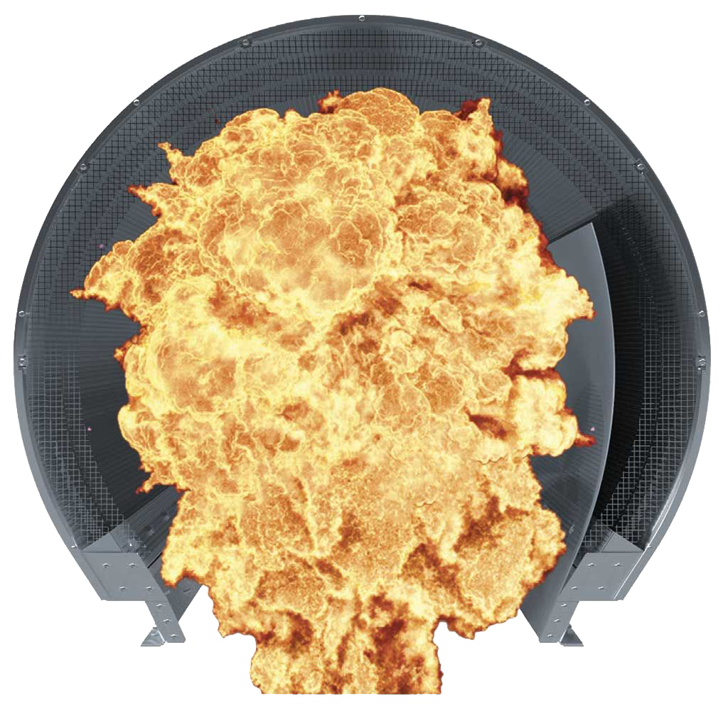 Like its two previous models, the new Q-Box® R3leaf™ guarantees safe explosion venting in manned areas. The flames are instantly quenched inside the Q-Box® R3leaf™ by the high-efficient cooling effect. The Q-Box® R3leaf™ is designed for dust explosion-prone applications of low design strength and the need for large areas to be vented such as required for filters, dryers, sifters, elevators or silos. The Q-Box® R3leaf™ complements the product line of REMBE® flameless explosion venting devices as is it optimized in terms of performance and sustainability. Based on systematic development the venting efficiency the maximum protected volume as well as the KSt value could be improved significantly. Hence, less flameless explosion venting devices are required, especially for larger vessels.